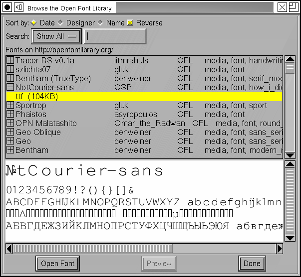 In the example at right the font "NotCourier-Sans" from Open Source Publishing is selected. This font is released under the Open Font License designed by SIL with the help of the community. The package just contains a truetype file (which is 104Kb in size).