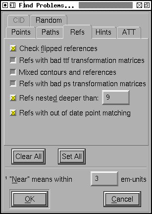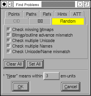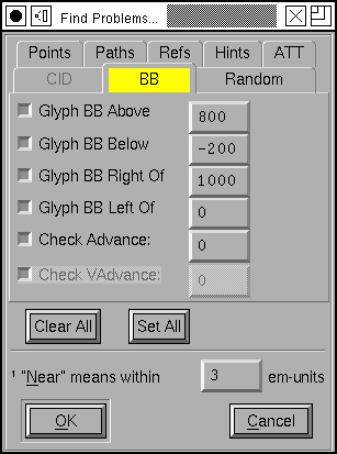 Often there will be a set of features which should be consistent across the entire file. For example the left side-bearing of the glyphs "BDEFHIKLMNPR" should perhaps all be the same. This will let you enter in the desired side-bearing value, and then FontForge will find all glyphs with points that are near, but not exactly on the desired value. Where "near" is defined at the bottom of the dialog (in this case, everything within 3 em-units -- in either direction -- will be near). If it finds an errant point, FontForge will select it, stop and let you fix it.