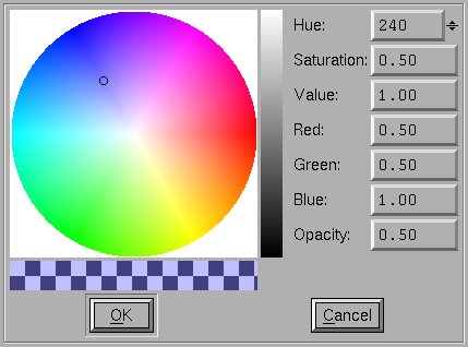 The color picker displays a Hue/Saturation/Value color wheel. A vertical bar on the right shows the Value, the wheel shows Hue and Saturation. The original color is displayed on the bottom left. The current color on the bottom right. If the color is not fully opaque a checker board of black and white squares will be visible under the colors.
