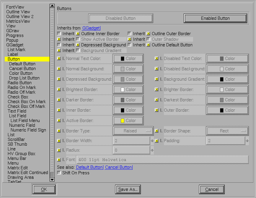 To the left of the dialog is a list of all fontforge's controls (and some other stuff). Every control is drawn within a box, and the box specifies a background, border, shape, size... Many controls have an associated font. Most controls inherit much of their design from other controls (The GGadget, which is an abstract control, is the root of the hierarchy). A particular attribute may be inherited from its parent, or it may be defined by the current control.