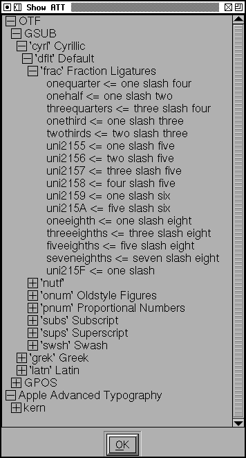 The GSUB and GPOS tables are organized as one might expect. Underneath each table is a list of scripts, underneath each script is a list of languages, underneath each language is a list of features, underneath each feature is a list of glyphs, generally with some description of what happens (in the example a right the 'frac' feature turns 1/4 into ¼). Some features are a little more complex (the 'kern' feature has a list of all glyphs that kern with the first glyph under the first glyph).