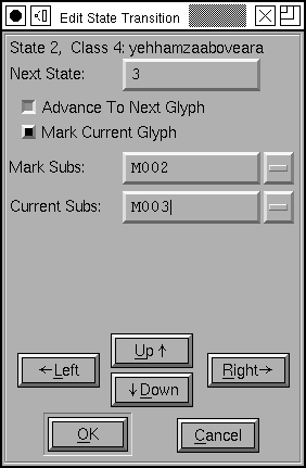 This can apply a substitution to the current glyph, a different substitution to the marked glyph, and it may mark the current glyph. The substitutions are indicated by 4 character tags and should be "Nested" substitutions which may be created by the Element->Char Info dialog. | This can insert a string (up to 31 glyphs) before or after the current and the marked glyphs. | Kerning does not have a single "mark"ed glyph, instead it can push up