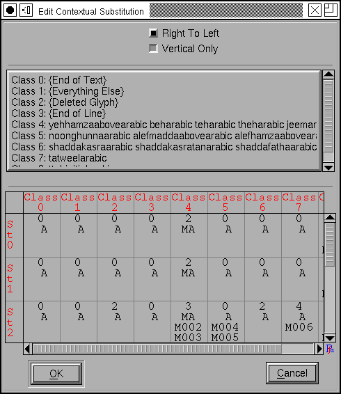 On the mac there are four predefined classes, one meaning the end of input, one for all glyphs not specified elsewhere, one for the magic "deleted" glyph (Apple does not always delete a glyph when asked to do so, instead it retains a special mark in the glyph stream indicating that the glyph should be deleted later), and finally a class for the end of a line of text. Any classes after this are user defined. In the example at right there are many user defined classes representing various groupings of arabic letters. Any other glyphs in the font (the digits for example) will automatically be assigned to class 1 ("{Everything Else}").