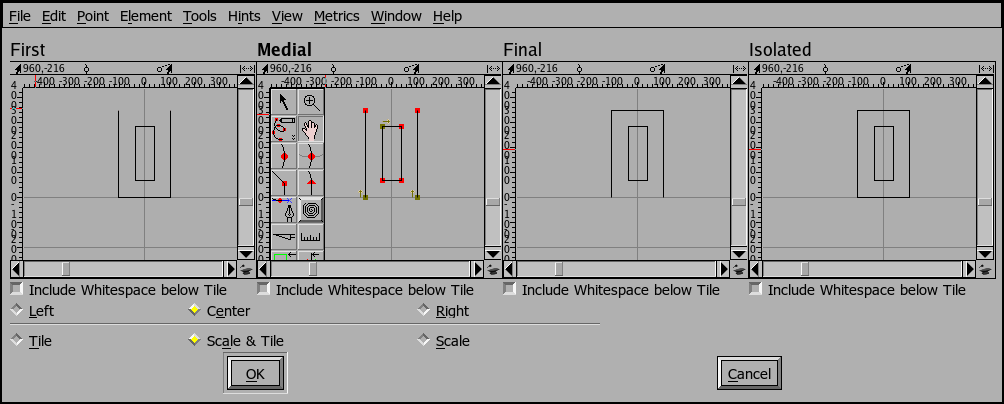 The tiling will start at the origin. After the pattern has been tiled you may apply other transformations to distort it into a non-rectangular shape, or use the Element->Overlap->Intersect command to clip it to some contour. Thus you can simulate some of the capabilities of a true pattern tile as is available in a type3 font.