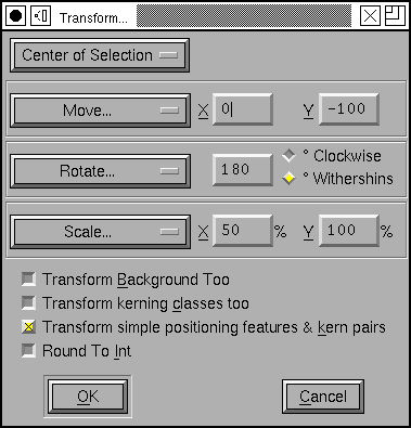 This dialog is available in the font, outline and metrics views. In the font view it applies to all selected glyphs. In the outline view if there is a selection then it applies to that. if there is no selection then it applies to the entire glyph.