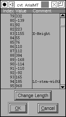 This dialog shows the initial contents of the 'cvt ' table (before it has been modified by the 'prep' program). It is simply a list of signed 16bit values. You may change any value by clicking on it and typing a new value. You may also attach comments to entries, this can be helpful in reminding yourself what this index is used for. You may add new entries (at the end) with the [Change Length] button.