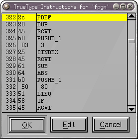 This dialog shows the instructions associated with a glyph or truetype table (like fpgm or prep). If you move your mouse cursor over one of the instructions a brief help message will pop up describing that instruction. If you press the [Edit] button the dlg will change and you will be presented with a editable textarea containing the same instructions. You may modify these to your heart's content. Pressing the [Parse] will parse your modifications and (if they parse) return you to the "help" mode.