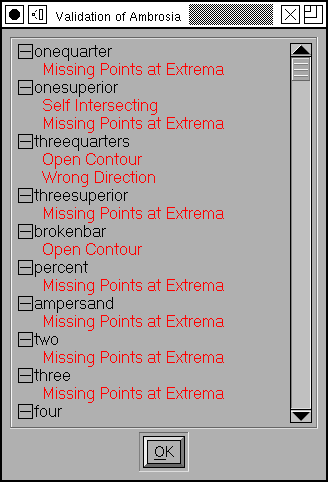 If you double click on a line in the window then FontForge will open an outline glyph editing window for that glyph, and run a small version of Element->Find Problems to help you track down exactly where in the glyph the error(s) occurred.
